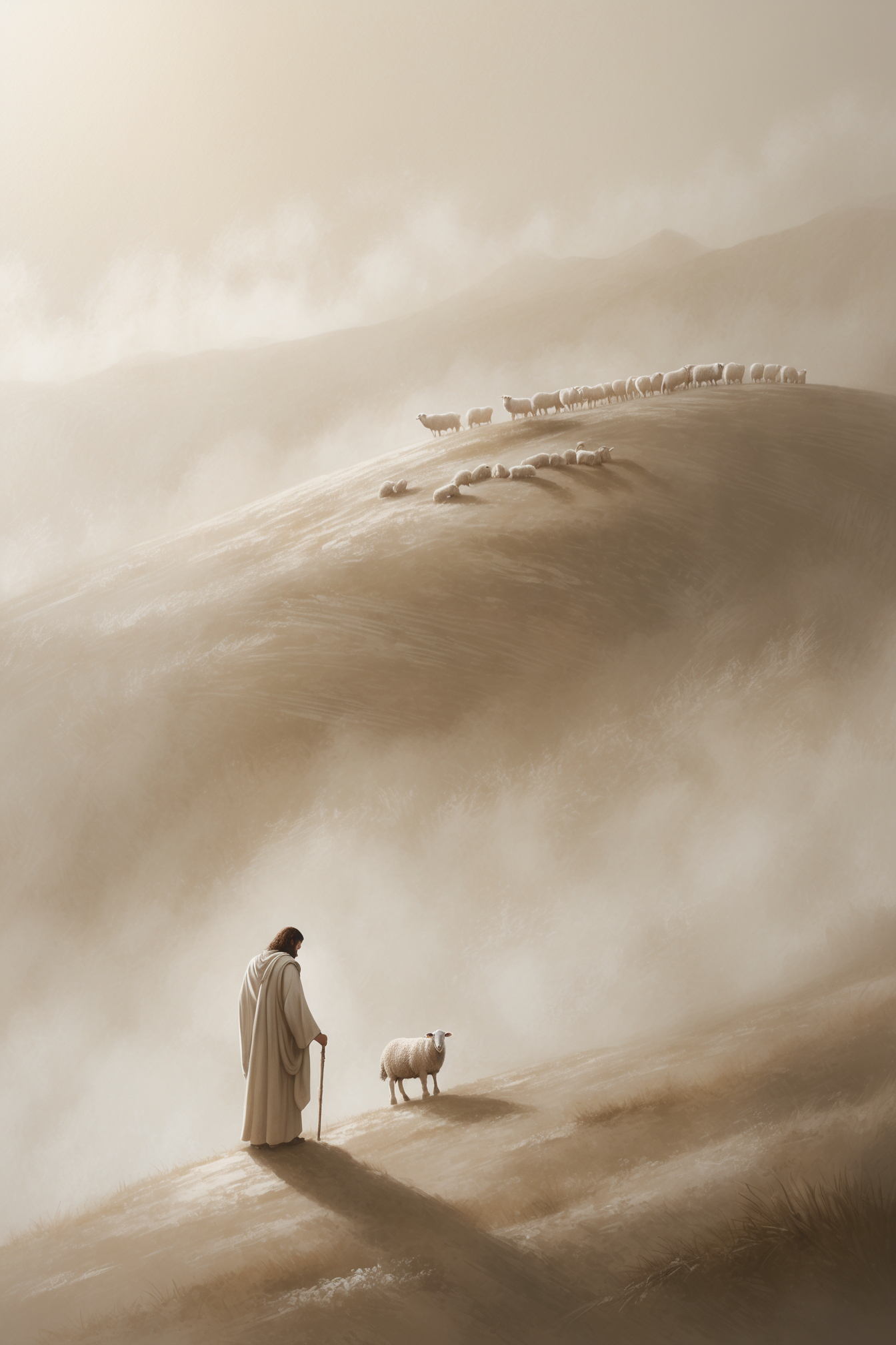 In the stillness of the misty hills, a Shepherd pauses, eyes fixed on a single sheep. Though the flock has already moved ahead, His gaze does not shift. There is no rush. No frustration. Only presence.